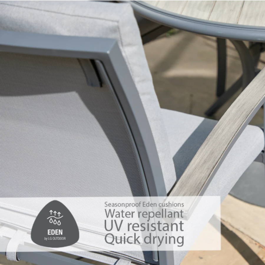 Cushions are crafted with Eden season-proof fabric, delivering water-repellent, UV-resistant, and quick-drying performance. Thanks to the StainSafe coating, everyday spills can be effortlessly wiped away with a sponge.