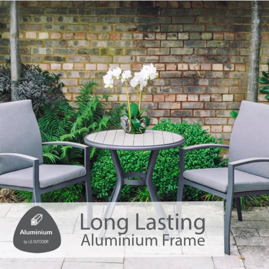 The Turin aluminium collection blends contemporary graphite-grey frames with wood-effect aluminium tabletops, creating a modern, maintenance-free range. Each tabletop is hand-brushed and slatted to deliver a highly realistic wood appearance with the durability of aluminium.