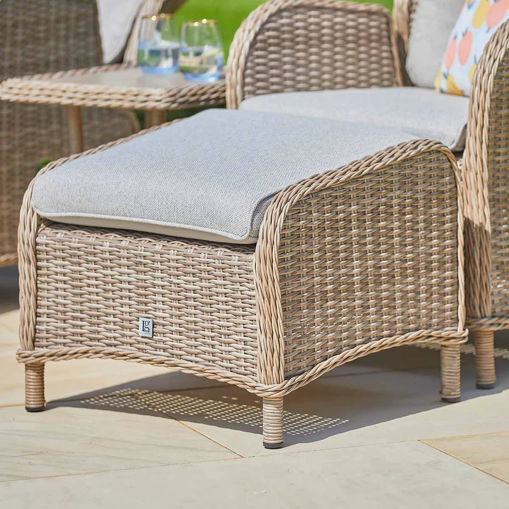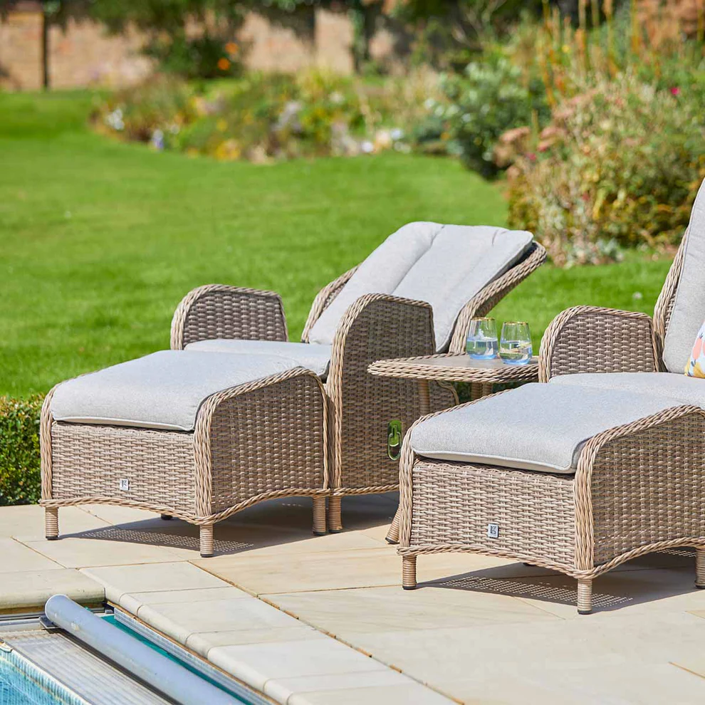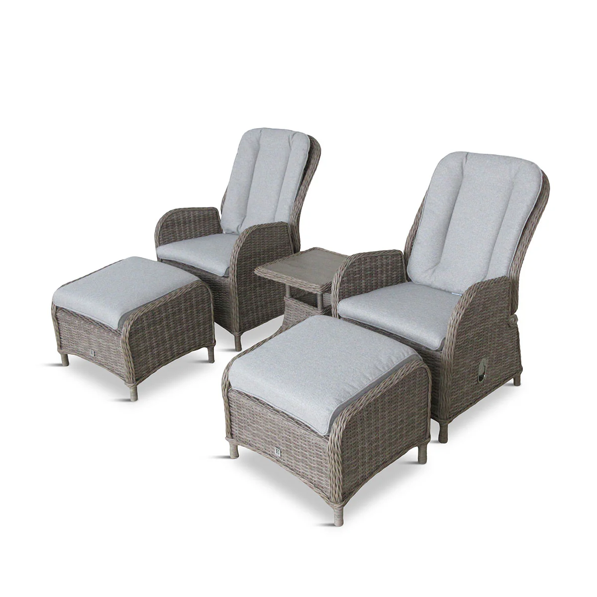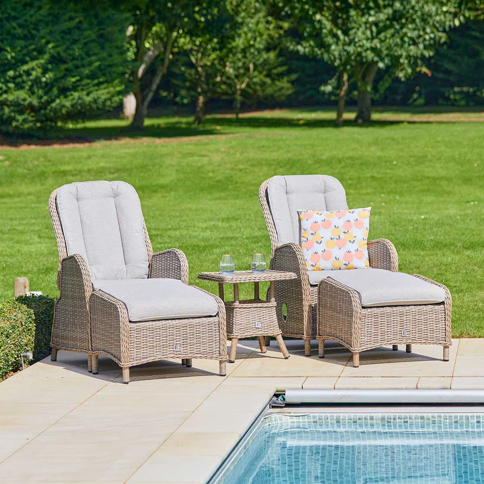 Unwind in comfort with the St Tropez 5-Piece Recliner Set. This set includes two fully-cushioned recliners, two cushioned footstools, and a stylish wood-effect side table—perfect for outdoor lounging, drinks, or snacks.