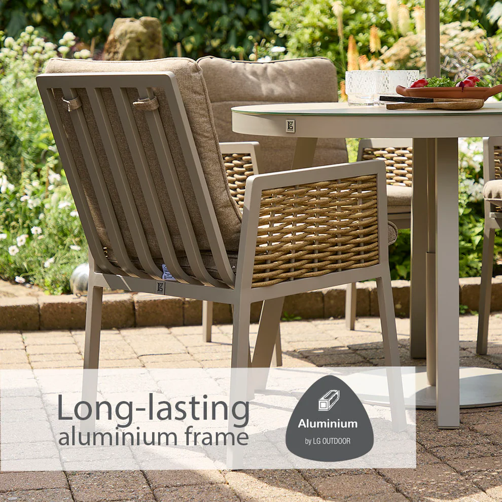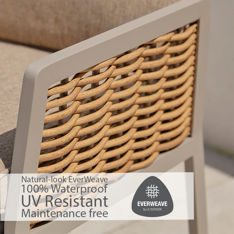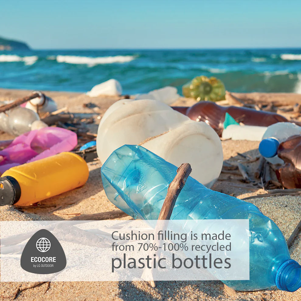 The cushions are filled with environmentally friendly EcoCore poly fibre filling, offering lasting comfort with a lower environmental impact. Lightweight powder-coated aluminium frames provide strength without bulk and deliver excellent UV resistance, ensuring long-term durability in outdoor conditions.