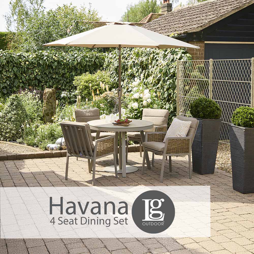 Elevate your outdoor experience with the durable Havana 4 Seat Dining Set. Crafted from premium, weather-ready materials, this stylish set is designed for relaxed outdoor living season after season. Featuring StainSAFE stain-resistant fabric and Eden season-proof cushions, spills, moisture, and everyday wear are easily handled.