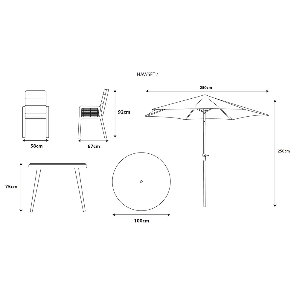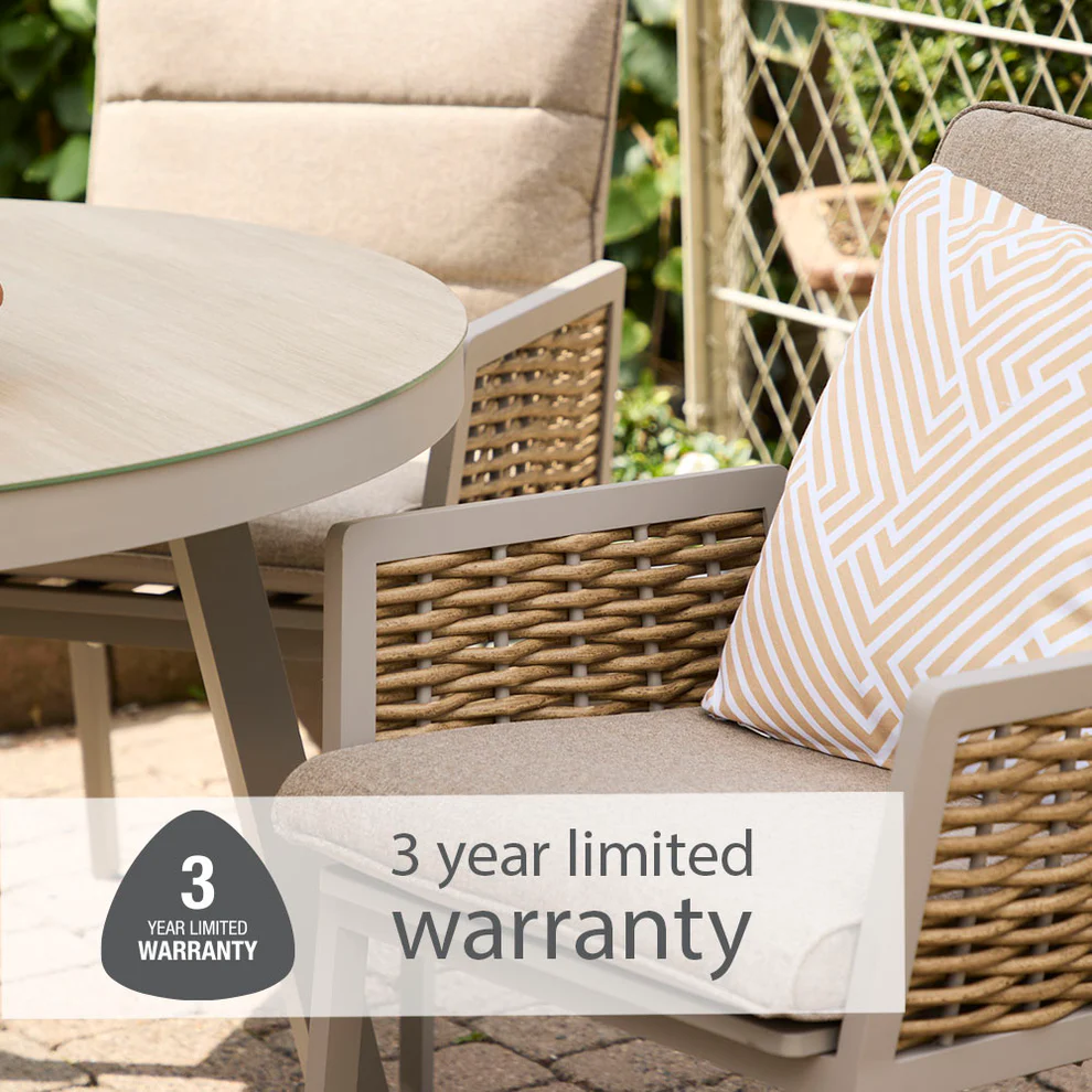Finished with wood-effect ceramic printed safety glass table tops, the Havana Bistro Set combines contemporary design with practical performance. Durable outdoor materials including aluminium, ceramic glass, natural-looking PE weave/rattan, spun polyester fabric, and EcoCore filling make this set a smart, stylish choice for modern outdoor spaces.
