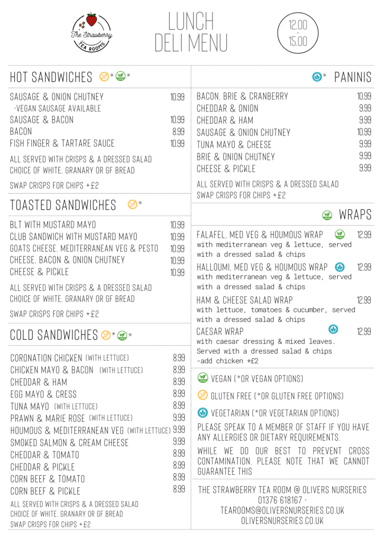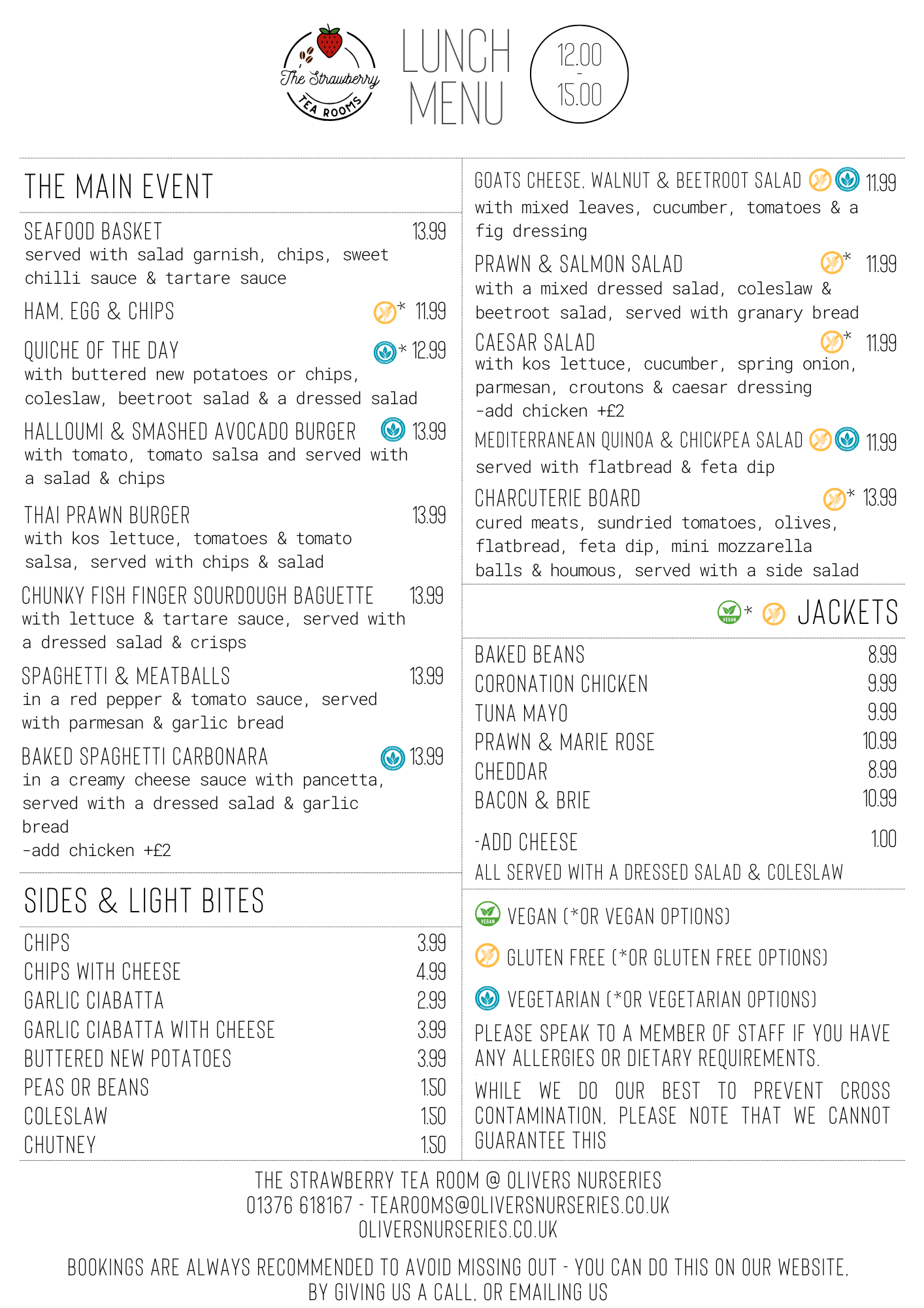 For further enquiries or to make a booking, please click on the link at the top of this page, give one of our friendly team a call on 01376 618167 or email tearooms@oliversnurseries.co.uk
